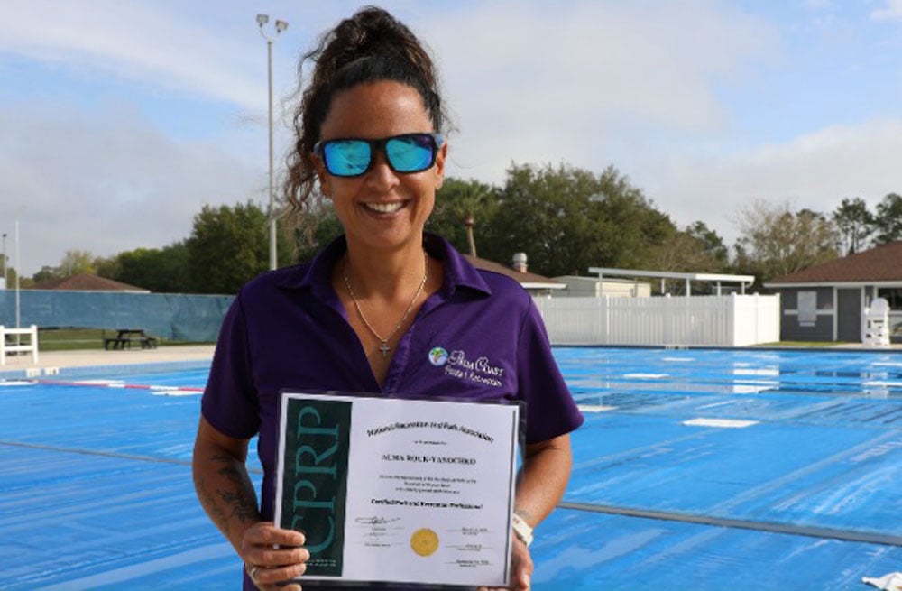 Alma Rock-Yanochko, the recreation supervisor at the Palm Coast Aquatic Center, has earned the Certified Park and Recreation Professional (CPRP) designation. She is the first city employee to obtain the credential during a tenure with Palm Coast.