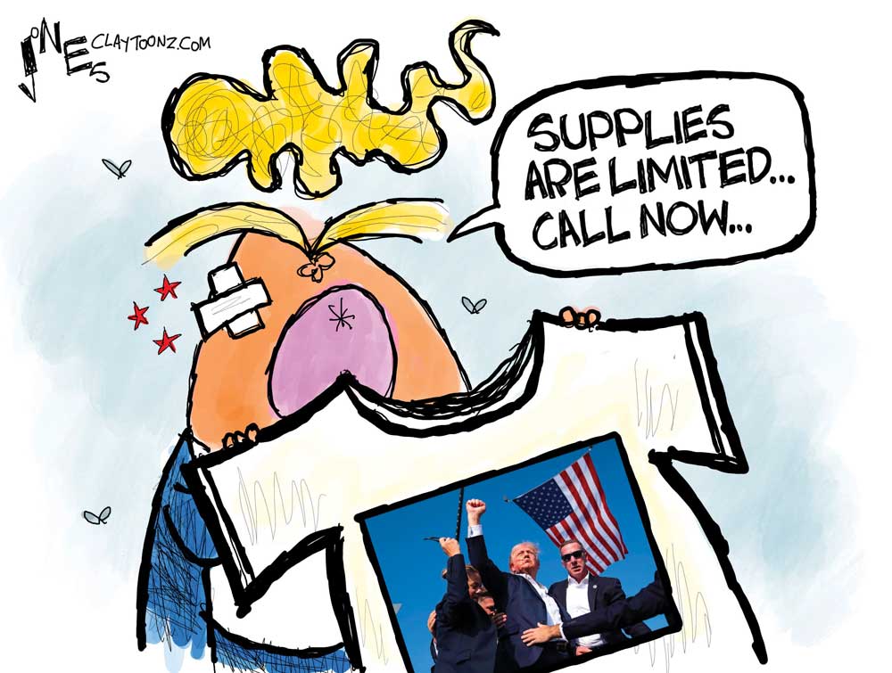 Anything can and will be used to vilify and deify. Medieval pilgrims traded gold for relics such as the alleged thumb of John the Baptist or vials of the alleged blood of Christ from his crucifixion. This will be the first presidential race in history when blood will feature front and center in the Trump campaign’s most iconic image, the candidate bloodied but fist-pumping as an Iwo Jima-flag-like clutch of brawn props him up. Trump is the flag. Trump is America. Welcome to assassination merch.