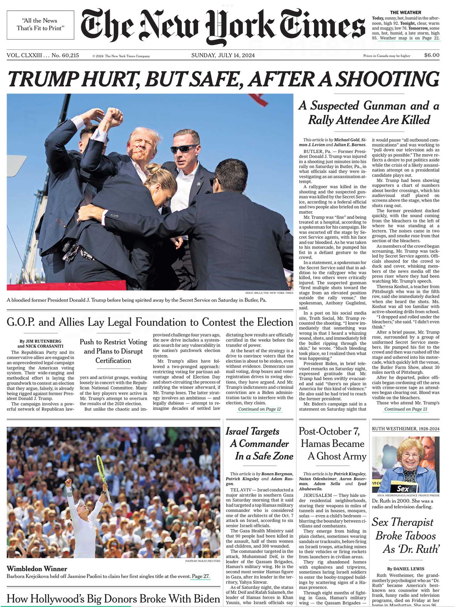 I am writing this less than 24 hours after the shooting in Butler, Pa. Trump had the good sense to say that “nothing is known at this time about the shooter,” as so much will be known soon. But the two sides have already staked their ground as if they knew as much about this as we do about Hinkley or Moore or Bremer or Sirhan or Oswald or Zangara or Schrank or… (So many names.)