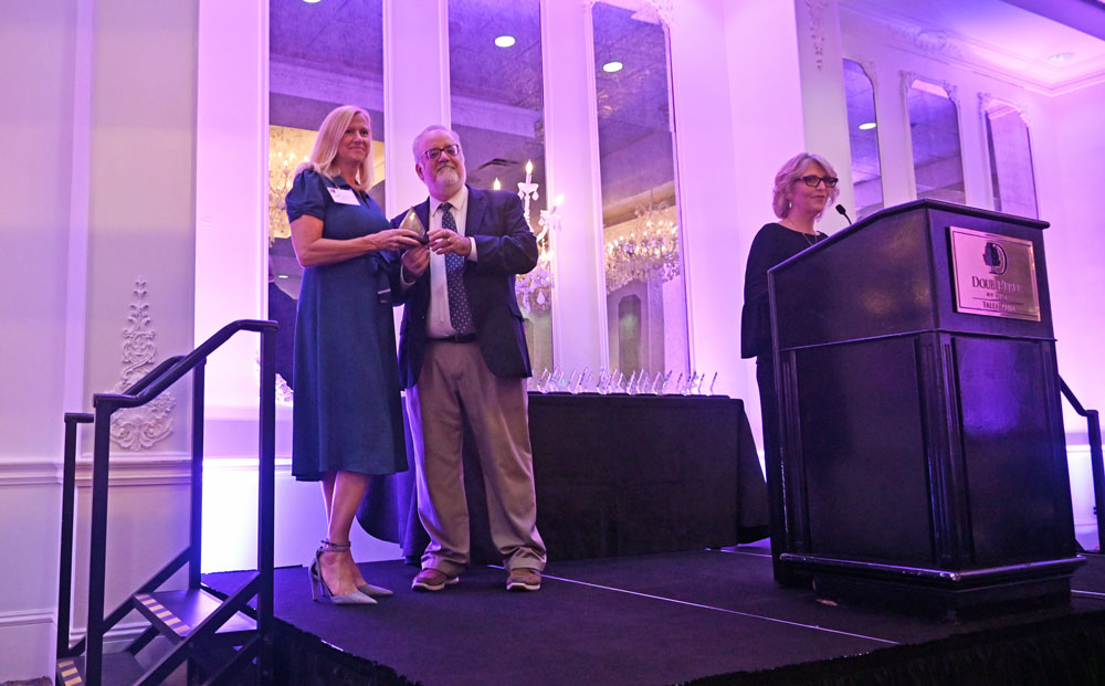 News Service Executive Editor Jim Saunders was the only man to ascend the speakers’ platform, as it was time for the awards, which he handed out one by one as Kam read the names and all too-brief biographies of the honorees. Baird, never entirely comfortable in those situations–she was the 2024 Palm Coast Citizen of the Year–navigated the wobbly set of stairs to the platform and accepted the hand-sized glass award shaped somewhere between a pentagon and home plate.