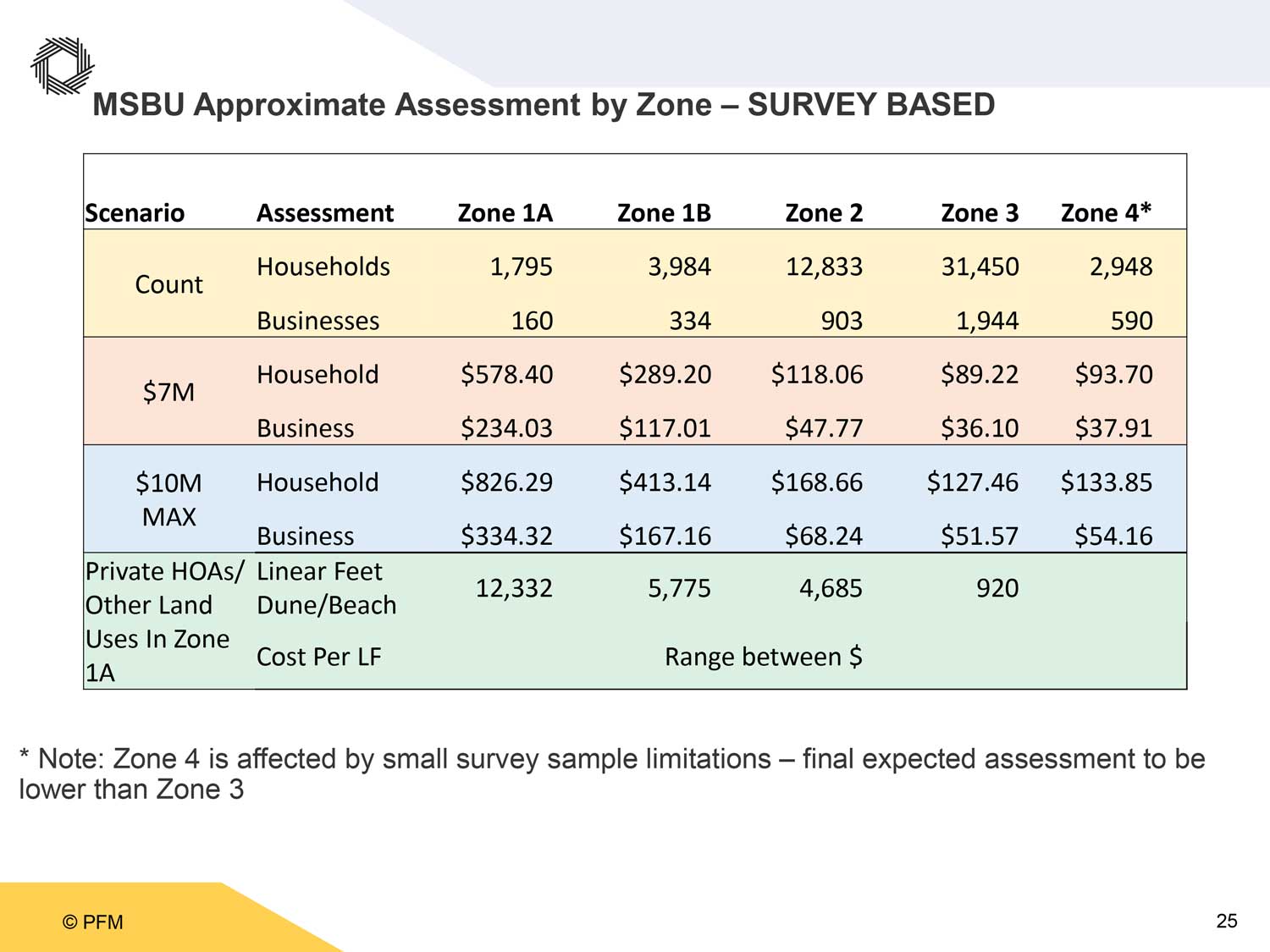 The dollar figures were based on a survey that was itself organized by naturally-breaking zones. Zone 1 was the barrier island (with Zone 1a reflecting beachfront properties, and 1b properties that ara away from State Road A1A). Zone 2 was from the Intracoastal to I-95. Zone 3 was from I-95 to U.S. 1. Zone 4 was from U.S. 1 to the west end of the county.