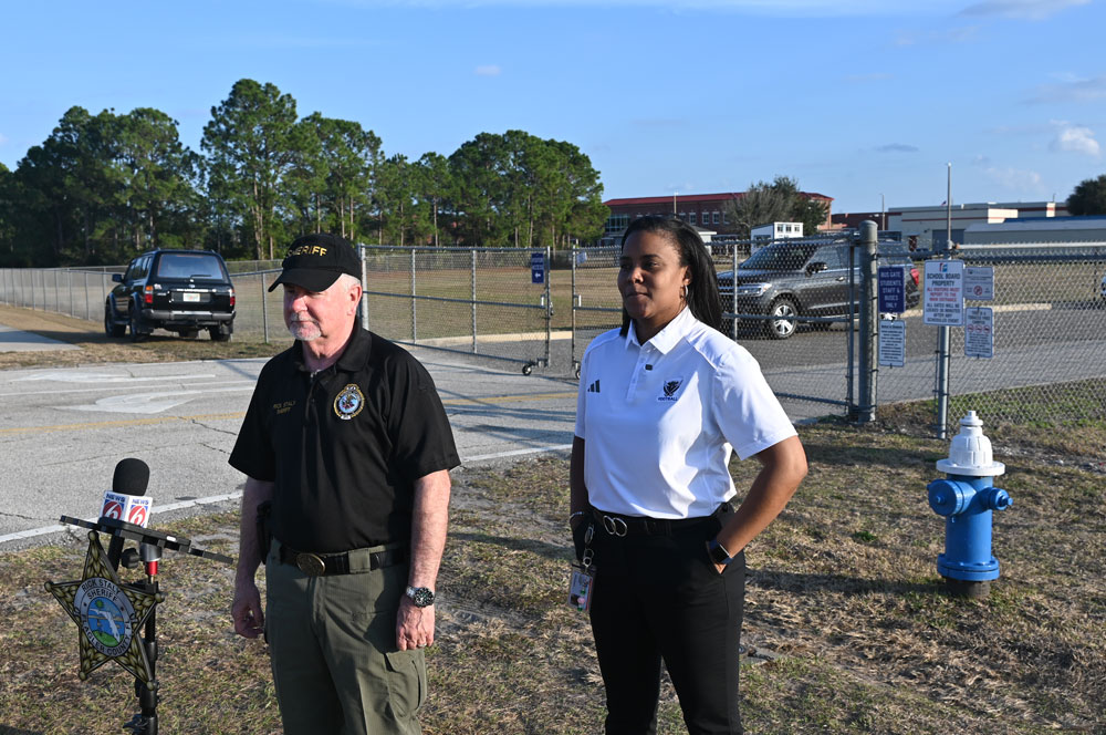 The student, whom Superintendent LaShakia Moore described as “an active student on our campus,” was with his mother, school personnel and deputies at Matanzas High School as the sheriff addressed the media outside one of the school’s gates by the football field just after 4 p.m., alongside Moore. (Mike Rinaldi, the Matanzas High School principal, did not appear.)