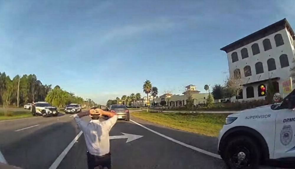 A body-cam video shows an Ormond Beach police officer, his gun drawn and pointed in Coma’s direction, screaming at Coma: “Put your hands up! Put your hands out the window now!” as several patrol cars pull up abruptly. It then shows Coma walking backward with his hands on his head, complying with the order to get on his knees, and getting handcuffed. As an officer removes Coma’s gun from his waist, the officer is heard saying, “dummy.”
