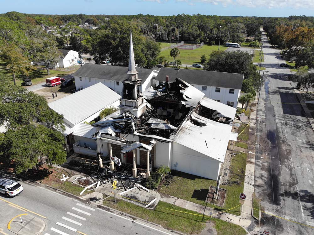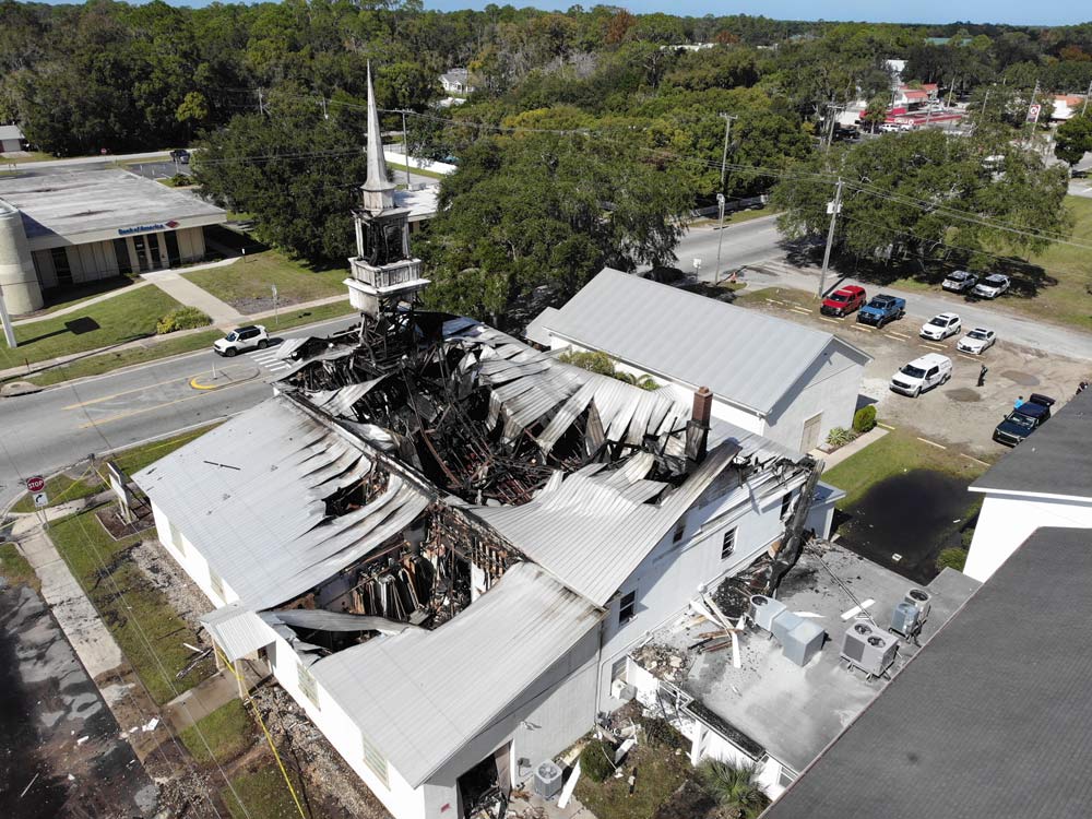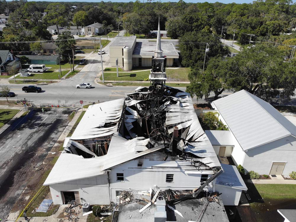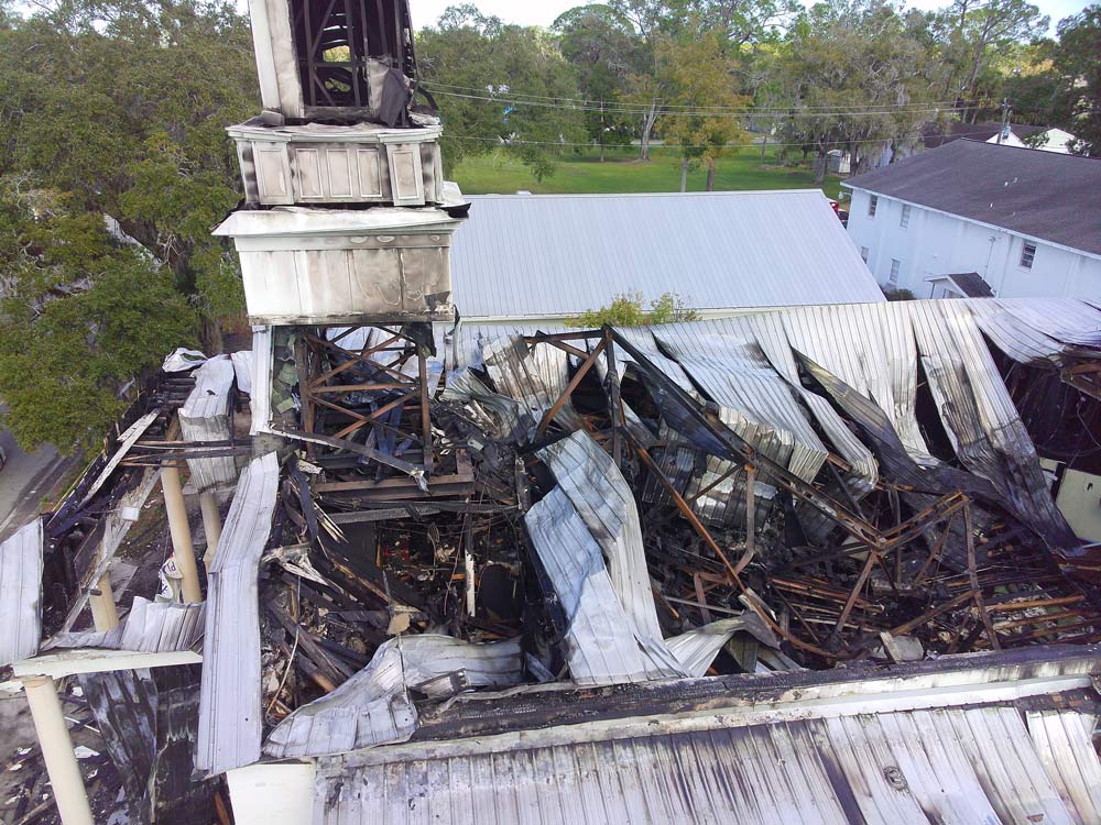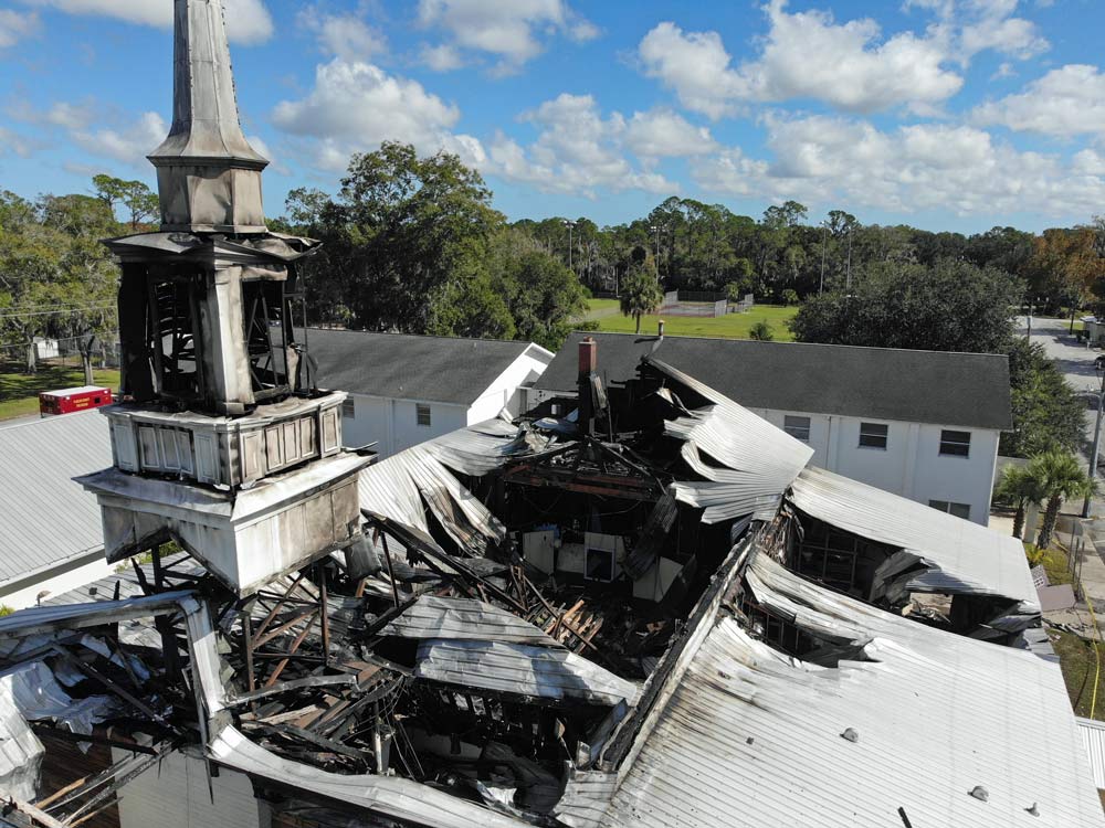 Certainly on a far smaller and architecturally less consequential scale, perhaps less on a spiritual scale as well, though no theater is ever quite devoid of the divine, but the drone footage Flagler County released of the devastation of the fire that consumed the Flagler Playhouse for half a dozen hours the night of Sunday into Monday morning cannot fail to evoke that familiar feeling, as when Notre Dame was gutted by fire in 2019, when a city’s defining landmark is as if bombed out, and its decades of history wiped out.