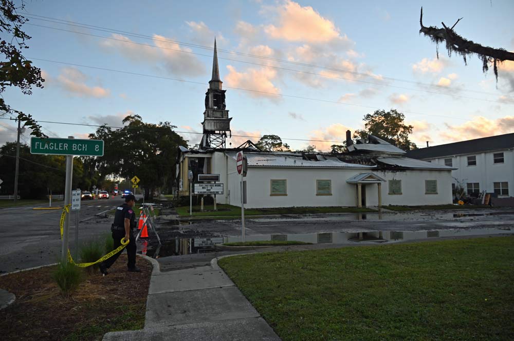 “They have already tagged the building as unsafe and so at this point the insurance as well as an engineers would have to get in. The insurance is going to have a lot to talk about,” Bunnell City Manager Alvin Jackson said this morning, referring to his building official. In other words, the building has been condemned. As for the spire, “they think that it’s not going to come tumbling down, but it will need to be addressed immediately,” by which Jackson meant it had to be removed.
