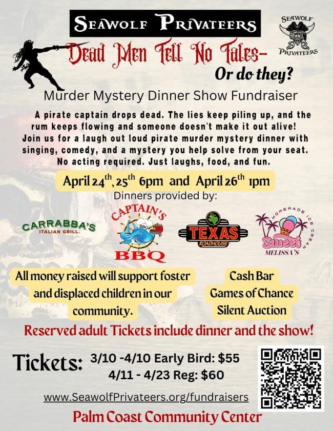 Dead Men Tell No Tales…. Or Do They? Murder Mystery Dinner Show, Palm Coast Community Center, 305 Palm Coast Parkway NE, 6 p.m. Friday and Saturday, 1 p.m. Sunday, tickets $60 a person. The fundraiser is for foster children. Book here. Join the Seawolf Privateers for a night of swashbuckling fun you won’t want to miss! Step into a rowdy tavern in Tortuga where pirates, rum, music, and mischief fill the air. Dead Men Tell No Tales… Or Do They? is a laugh-out-loud pirate murder mystery dinner show packed with slapstick comedy, outrageous characters, and a twisty mystery that will keep you guessing until the very end. Feast on a hearty dinner while the tale unfolds around you, with surprises, laughs, and plenty of pirate mayhem along the way. Best of all, every ticket helps make a difference—all proceeds support local foster and displaced children in our community. Come for the laughs, stay for the adventure, and help us do some good along the way!