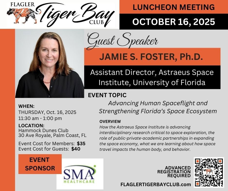 Flagler Tiger Bay Club Guest Speaker Jamie Foster, Ph.D., Assistant Director, Astraeus Space Institute, University of Florida. Today’s topic: Advancing Human Spaceflight and Strengthening Florida’s Space Ecosystem–how the Astraeus Space Institute is advancing interdisciplinary research critical to space exploration, the role of public-private-academic partnerships in expanding the space economy, what we are learning about how space travel impacts the human body, and behavior. 11:30 a.m. at Hammock Dunes Club, 30 Ave Royale, Palm Coast. $35 for members, $40 for guests.