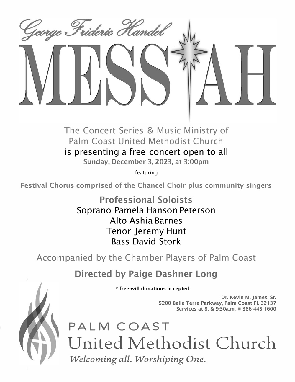 Handel’s Messiah Performed by the Festival Chorus and the Chamber Players of Palm Coast, directed by Paige Long, 3 p.m. at the old Palm Coast United Methodist Church, 5200 Belle Terre Parkway, Palm Coast. Please note that the church sign at 5200 Belle Terre Parkway reads CLC (Christian Life Center). The Music Ministry of Palm Coast United Methodist Church is presenting the Christmas portion of Handel’s Messiah, concluding with the Hallelujah Chorus. Complete with professional soloists, large Festival Chorus, accompanied by orchestra, this concert is free and open to all. Please invite family and friends as well as pass this info onto anyone interested. With Soprano Pamela Hanson-Peterson, Alto Aisha Barnes, Tenor Jeremy Hunt, and Bass David Stork, accompanied by the Chamber Players of Palm Coast, directed by Paige Dashner Long. The concert is free. Donations are accepted. Note: This year, the alto soloist is a local, home grown Palm Coast professionally trained singer – Ashia Barnes. Ashia graduated from FPCHS and earned her Associate’s Degree in Voice from Daytona State College. Then continued her studies and earned her Bachelor’s Degree in Classical Voice from the Manhattan School of Music in New York City. She is now working on her Master’s Degree in Vocal Performance at the Frost School of Music at the University of Miami.