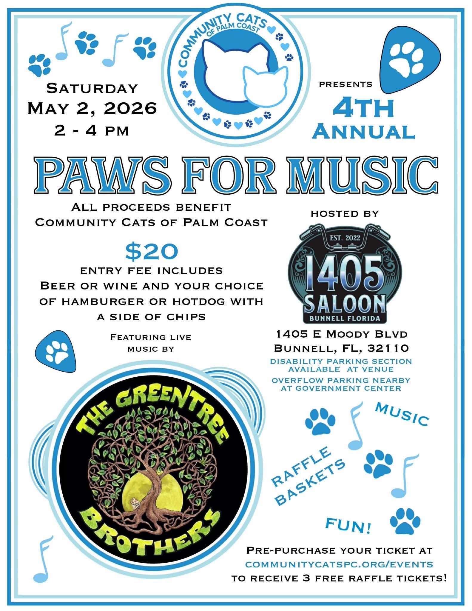 Paws For Music: Community Cats Fundraiser: 2 to 4 p.m. at 1405 Saloon, 1405 East Moody Boulevard, Bunnell (near the courthouse). $20 entry fee. Fundraising Event for Community Cats of Palm Coast in their efforts in reducing the homeless stray population in Flagler County. Community Cats is a 501c3 Nonprofit organization.