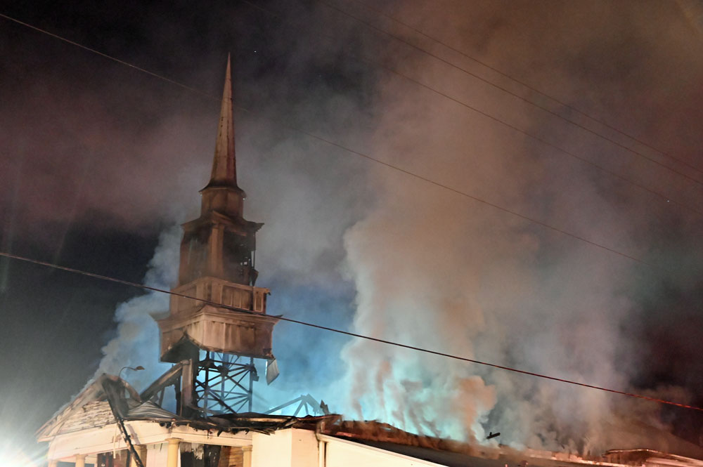 Firefighters conducted an initial attack after forcing some of the doors. The report notes that that team was able to advance through the pews (the seating area) where there was no visible fire, all the way to the rear where they found the fire, behind the stage. A small fire was found at the base of the stairs, with more fire going up the stairs. “Crews extinguished first fire and advance[d] up the stairs,” the report states, where “moderate” fire was found. The fire was put out, but visibility dropped, and “the bulk of the fire was never fully located. It appeared to be in void spaces on the second floor that we were not able to get good access to. Outside crews advise that fire had vented through the roof in our location however the hose team was never able to locate that fire.”