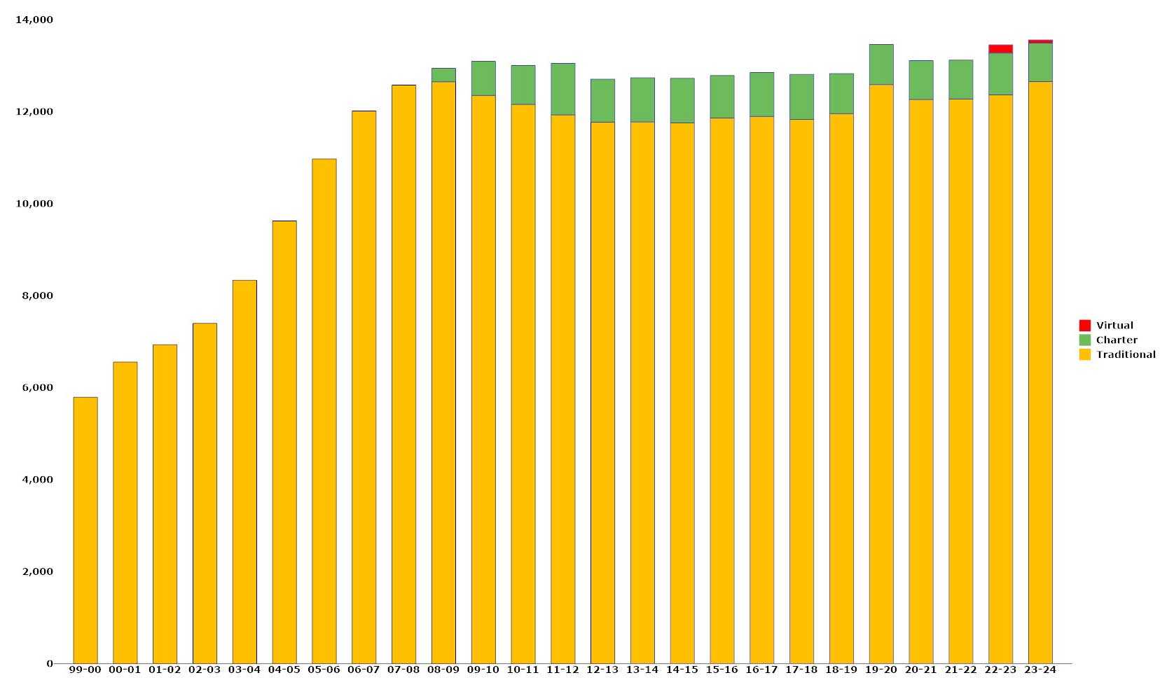 Enrollment in the district’s nine traditional schools in May, at the end of the school year, was 12,659–almost the exact enrollment in the 2008-09 school year. It has fluctuated up and down since, and this May’s enrollment is up by 300 over last year, but it is hardly an increase over pre-Covid enrollment.