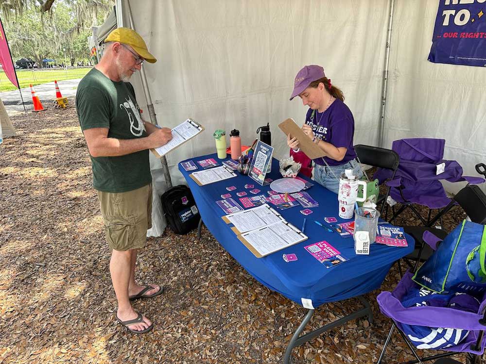 Among the two dozen food and vendor tents lining the sidewalks at the Orlando Fringe theater and arts festival was People Power for Florida’s table, cluttered with voter registration forms, stickers, and about 50 mismatched pens.