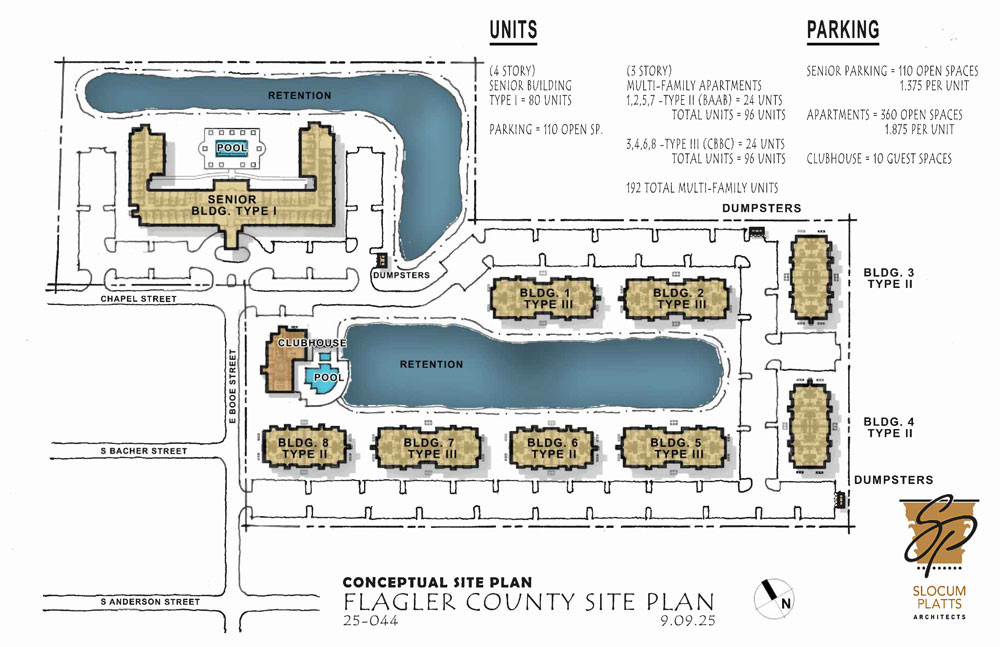 Typically when “repositioning” takes place, the government is required to offer residents whose houses or apartments are being demolished a housing option as they wait for the new buildings to be habitable. The Carver Village plan is all in the conceptual stage, however, with the Housing Authority focused on getting regulatory changes enabling it to build the apartment complex at a much higher housing density in South Bunnell. The conceptual site plan calls for eight three-story apartment buildings of 24 apartments each, and the senior center with 80 apartments. There would be a clubhouse and two pools, and two vast retention ponds would be carved out of existing land to make up for the reduction in permeable surface.