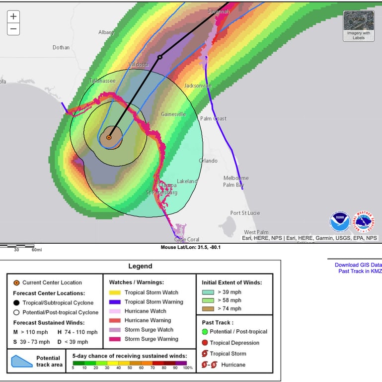 The map below from the National Hurricane Center shows the latest track of Hurricane Idalia and the probability that winds will reach 50 knots (57 mph). Palm Coast is just outside the edge of the cone of sustained winds, with the green area signifying a 30 percent chance or less of receiving sustained winds of that magnitude in the next days: