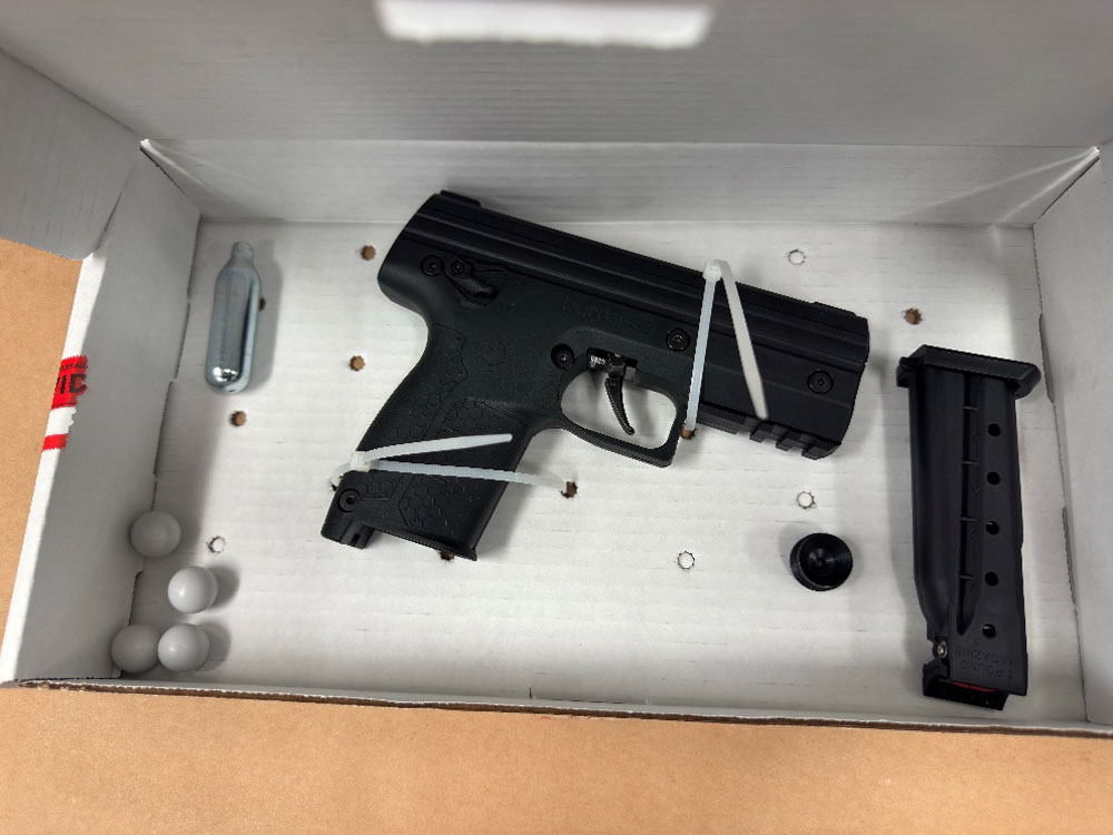 The black pistol was found to be a Byrna SD pepper ball gun with four hard white pepper balls and a black magazine. It looked indistinguishable from a firearm.