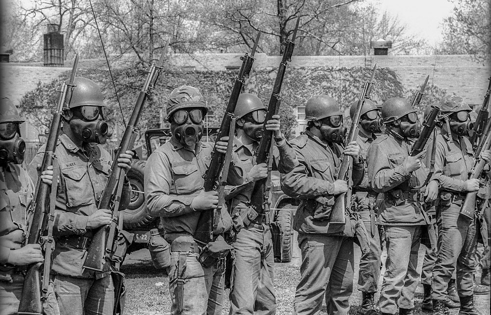 In Ohio, Gov. James Rhodes deployed the National Guard to quell protests at Kent State University. Monday, May 4, saw a large midday protest on the main campus commons. Students exercised their First Amendment rights by chanting and shouting at the Guard troops, who dispersed protesters with tear gas before regrouping on a nearby hill.