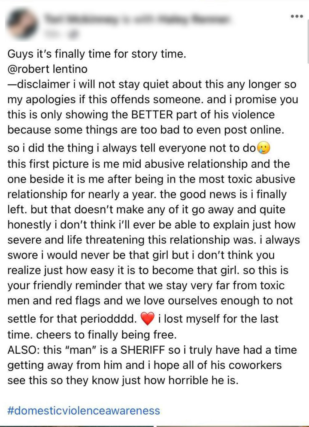 I have silent so far, letting everything play out. As her Mother I am completely disgusted that Robert Lentino laid a finger on my daughter. Her Father and I have made sure she has had very good representation in the attorney we chose. If my husband had done. Said. Threatened me in the ways Robert Lentino did to our daughter, he would have paid for it yesterday! A 13 year old girl has had more severe consequences, that is until now. The pressure has been put on. The news ( any and every channel) has as much information on the abuse she suffered. The injunction that was clearly granted without hesitation and extended for two years took away the ability he had to carry the firearm that he held to my daughters head and the vehicle he used as intimidation! He is no longer a “Deputy” and will not be aloud to be again. His resignation shows his guilt. Our daughter is a very bright, beautiful, loving woman that would do anything fir anyone. She is educated, hard working, caring and has a family that is full of faith, love and support! We will not back down! She will not stop until the criminal in him pays for trying to end her life!