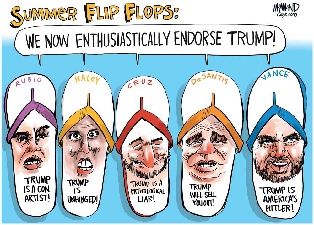 This cartoon sums up the Republican party of 2024. Everything is “Heil Trump” with no acknowledgement of all his failures, his lies, his felony convictions, his conviction on rape (yea, rape – look at what the judge said), theft of top secret government documents (hidden strategically in a toilet), sex with a porn star while his (3rd) wife is having his child, magnificent leadership of the country during the Covid pandemic(drink bleach, swallow a flashlight, 1M dead), kissing the ass(es) of every dictator in the world who would hold still long enough, abandonment of our allies, misogyny on levels “no one has seen before”, veterans are “suckers and losers” (quote from his 4-star general chief of staff), pardons of his cronies for crimes they were convicted of by evidence, just to name a few of his more infamous “accomplishments”.