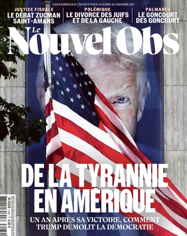 Notably: Alexis de Tocqueville devoted two chapters to “Causes Mitigating Tyranny in the United States” in his endlessly quoted and never read Democracy in America. Tocqueville was concerned with the tyranny of the majority, as the founders had been. He saw states, counties and cities–local government–as ideally suited to check the federal government’s tyrannous tendencies, though his analysis was a bit faulty: he thought those local governments would be like brakes on mob tendencies. He had not experienced moms for liberty meetings. He also saw lawyers and judges as powerful forces against tyranny. Again, his theory shone brighter than practice, now that a federal judiciary (and in Florida, a state and circuit judiciary) mirror the executive’s worst tendency to the point of sycophancy. Letting it all rip: ICE goons. The military in our streets. Bombing boats. silencing media and law firms. This week’s cover of Le Nouvel Observateur, one of France’s weeklies, rips on Tocqueville and cuts to the chase, as one doubts Newsweek, Time or any other American magazine, save The Nation or Mother Jones, would. American Midnight is back.