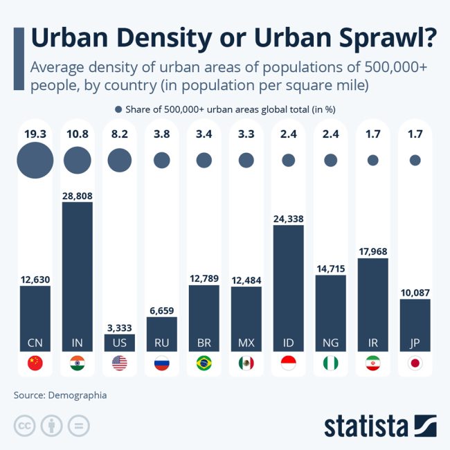 Notably: In case you feel closed in. From Statista: “While Asian nations tend to have more compact urban spaces, countries like the United States and Russia lean more towards urban sprawl even in very big cities, resulting in a lot of exaggerated soil sealing in these areas. While China houses 12,000 people per square mile and India does as many as 28,000 on average, these figures are just around 3,300 in the U.S. and 6,600 in Russia. However, due to China’s and India’s large population numbers, their share of the globe’s large urban spaces with more than 500,000 inhabitants is 19 percent and 11 percent, respectively, also leading to the coverage of a lot of natural surface with buildings, roads and other potentially harmful obstructions. In the U.S. and Russia, these figures stand at 8 percent and 4 percent. Japan, known for its large and dense urban cityscapes, only houses around 10,000 people per square mile on average in its large urban conglomerations, which make up 1.7 percent of the globe’s total. Brazil and Mexico surpass this at 12,000-13,000, as do Nigeria (15,000) and Iran (18,000). Other countries with very dense large urban spaces are Colombia (38,000), the Democratic Republic of the Congo (40,000) and finally a country known for its extra dense cities, Bangladesh (55,000).”