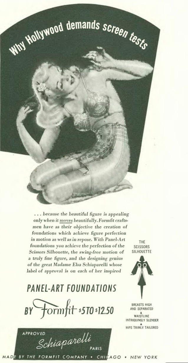 Notably: Page 55 of the March 9, 1940 issue of The New Yorker, alongside the never-collected story by John Cheever, “Survivor” (“The moment I sat down at the bar he turned to me and began telling me how the torpedo struck this boat he was on, and how the crew and the passengers took to the lifeboats and bobbed around in the Irish Sea hour after hour until finally they were rescued by a Norwegian freighter,” it opens), features this ad you see at the bottom of this item. It’s very possible that Betty Friedan, who would have been 19 at the time and was still Betty Goldstein and a Marxist, saw it in her dorm at Smith College and decided to devote her life to feminism. I did not know, as surely you did not either, that Hollywood demands screen tests “because the beautiful figure is appealing only when it moves beautifully,” and because “you achieve the perfection of the Scissors Silhouette,” defined as “breasts high and separated,” “waistline intriguingly slender,” “hips trimly tailored.” I had never heard of, let alone seen, the “scissors silhouette,” but The New Yorker saw it fit to include it, alas, not as a cartoon. Looking up the Formfit Company of Chicago and New York, one learns from Wikipedia that it was “a manufacturer of women’s “foundation garments”, mainly corsets and girdles. Founded in 1917 with headquarters in Chicago, Illinois, Formfit later became known for other types of lingerie, particularly bras and briefs.” Its move to Mexico and Victoria’s Secret’s rise sent the company into decline until it was acquired by Jockey International in 1997. When I google “scissors silhouette,” all I get is scissors. Might I find the Scissors Silhouette with Find a Grave? Or did Betty Friedan do to the Silhouette what the men of the USS Carl Vinson do to the body of Osama bin Laden, if according to Islamic ritualistic norms? I’m not at all sure that bin Laden did more hard to people than that Silhouette, an American version of China’s binding of little girls’ feet, of France’s cranial deformations or of universal tight-lacing.