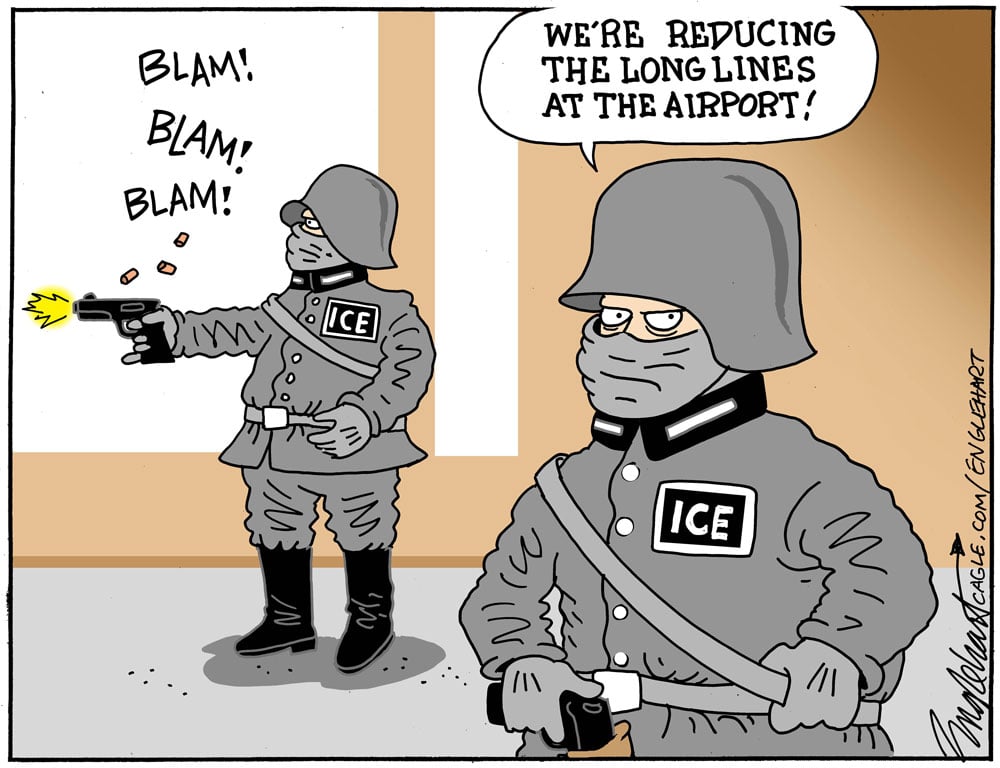 I expect the unstable people you are referring to are ICE and their mobs. We do not have to be a Nazi regime to adopt Nazi tactics. ICE tactics, encouraged by Trump and his junta, straight out of the totalitarian playbook. They are not gunning people down at airports, no, though you’re doing an effective job of gunning down satire, and they are gunning down civilians elsewhere, among other aberrant, police state—and yes, Nazi—behavior, masks, proud boyhoods and illegal roundups included. If you don’t think that concerns us all, making every such act anywhere in the country as “local” as it gets, you are conveniently not paying attention. If only the cartoons were ridiculous. May the days they were return, though for now and the next three years that’s a vain hope, thanks in no small part to heads-in-the-sand anonymous commenters like you.