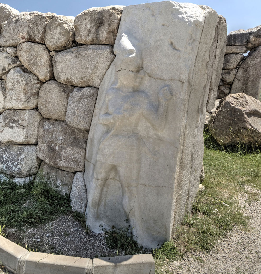 Notably: The image above, from Turkish Archeological News, is of “The King’s Gate” in Hattusa, in central Turkey, once the capital of the very powerful Hittite civilization and empire in the second millennium BCE. It is today a UNESCO Heritage Site. “A monumental enclosure wall of more than 8 km in length surrounds the whole city,” the page on the UNESCO site states. “There are remains of older walls around the lower city and section walls dividing the large city area in separate districts. The ruins of the upper city’s fortification form a double wall with more than a hundred towers and, as far as is known today, five gateways: two in the west, the Lion’s Gate in the south-west, the King’s Gate in the south-east and a procession gate, the Sphinx Gate in the south of the city. The latter is located on top of a high artificial bastion with stone-plastered slopes, with two staircases leading to the gateway at the top and an arched stone tunnel running underneath. The impressive ruins of fortifications, placed on rocky peaks in the centre of the Upper City, bear witness to the complexity of Hittite rock masonry, and the longest known Hittite hieroglyphic inscription from the Hittite Empire can be found in the Upper City at Nişantepe.” The “King’s Gate” received its name from a relief carved at the base of the archway. My Pleiade edition of the history of that era describes the sculpture above: “This sculpture is one of the most famous examples of Hittite art from the New Kingdom. In high relief, the silhouette of a male figure stands out on the block, wearing a pointed helmet with cheek guards. His face is youthful and beardless. The man advances to the right with a determined air. Dressed in a short loincloth, his torso is bare, and the sculptor has meticulously depicted the abundance of body hair. In his right hand, the figure holds a finger-handled axe (a valuable dating marker), while a curved sword is tucked into his belt. His left hand is closed in a deliberate gesture. His legs and feet are bare. The figure’s identity remains uncertain: god or king? The small horn affixed to the side of the helmet is a clue cited by those who favor the former hypothesis. The weaponry, however, is more suited to a monarch than a deity; the placement of the relief also makes it quite understandable that it depicts the king entering his city, perhaps returning from a victorious campaign and at the head of his army. Indeed, his face emanates the contentment that success brings, as well as confidence in the future.” The raised fist looks a bit too familiar. But for the nobility and art of the king represented in the statue, I could’ve sworn it had a maga air about it. I am surprised Ubu Roi has not had the stele stolen and brought stateside, maybe placed in front of the Donald Trump Center for the Performing Arts.
