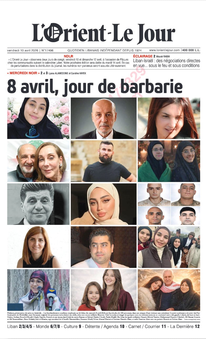 Notably: The image above was the cover of L’Orient-Le Jour, Lebanon’s French-language daily, on April 10, two days after Israel’s massacre of 300 Lebanese on a day that saw 100 air raids in 10 minutes and left areas of the country more leveled than through almost a dozen Israeli invasions going back to 1978 and the 1975-1990 civil war, and that sent Lebanon’s civilian death toll since March 2 to around 2,000, soon to be twice the number of Israelis massacred by Hamas on Oct. 7, 2023. Israel called the April 8 assault “Eternal Darkness.” As if it were a video game. Because that’s what the Lebanese are to Israel, as are the Palestinians, the Iranians: not even subhuman, but shadows on a screen to be erased, vaporized. That Israel is committing war crimes is beyond dispute. So is a world of indifference that makes it complicit. “Les autres signent et le Liban saigne,” went the lead headline of the April 9–“Others sign and Lebanon bleeds,” though the word “bleeds” doesn’t rhyme with the pun of the original French. Here is the translation of the caption below the front page on April 10, putting names and lives to some of the faces: “Poet, radio host or volunteer… Simultaneous Israeli bombardments on Lebanon on Wednesday, April 8, 2026, killed more than 300 people, in an attack of unprecedented violence. The Israeli army said it targeted Hezbollah infrastructure, but the overwhelming majority of people killed were civilians, according to a Lebanese military source. Here are the names and faces of some of the victims killed on this “black Wednesday” (from left to right, top to bottom): Fatima Amhaz, Fouad el-Berzali, Ghada Dweish, Hamun and her husband, Jamil Jrah, the sisters Rayane and Rahmé Haidar Cheaih, Nader Khalil, Ola Attar, the four soldiers Hussein Khaled Yassine, Mohammad Bassam Chheitli, Ali Hassan Kamem and Ali Nassereddine; Rana Molaeb, Said el-Khansa, seven members of the Nassereddine family, Suzanne Khalil, Toline Ahmad Hamzé and Yasmine Hussein Alam, and finally Yasmine Alam with her parents Hussein and Fatima Alam.”