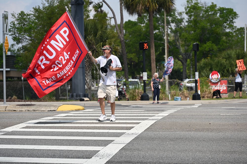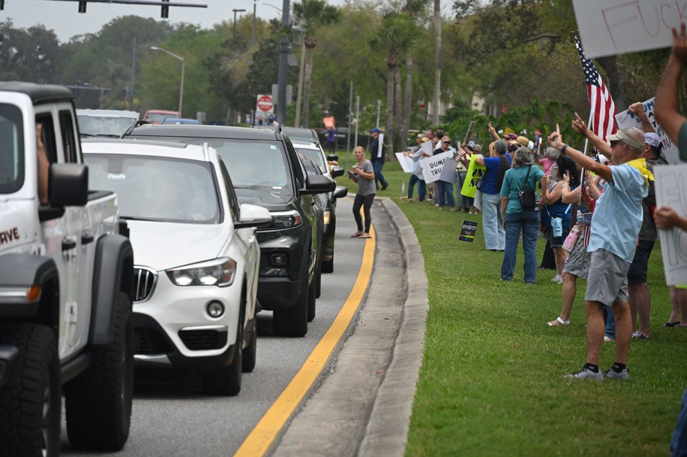 That was Matthew Wilson, a long-time Palm Coast resident who’d been to previous protests, and who, over the din of prolonged honking, cheery yells and the occasional wafting of “commies” and “who’s your daddy? Trump’s your daddy!” from the Trumpist counter-protest across the way, had observed drivers’ reactions enough to come up with a couple of conclusions.