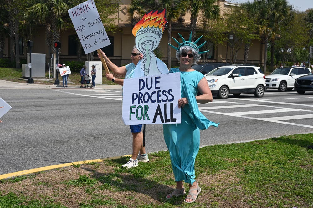 The variety was limitless. In Palm Coast a woman dressed as Lady Liberty held a huge sign mirroring the statue’s flaming torch above a “Due Process for All” sign. In Flagler Beach a woman had used two balloons to make a corpulent likeness of trump, one for his body, one for his head, his mouth a scarlet red “O” with just a hint of a sex doll’s orifice.