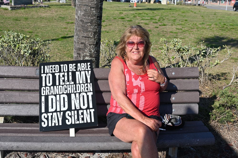 In Flagler Beach, Patricia Boniewicz, 67, was resting on a bench next to a sign that said: “I need to be able to tell my children I did not stay silent.” She is a 67-year-old Texan who’d grown up in the Panama Canal Zone between the ages of 7 and 13 and spent most of her life in Washington D.C., where her husband worked for the Federal Elections Commission. She has four grandchildren between the ages of 13 and 25.