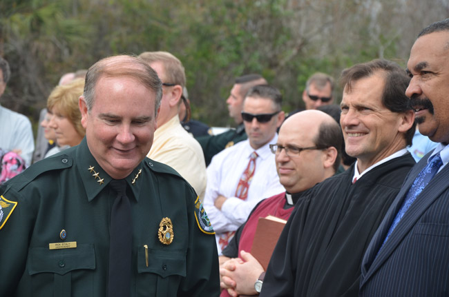 The event drew Bunnell Mayor Mayor Catherine Robinson, Bunnell Commissioner Tonya Gordon and Bunnell City Manager Alvin Jackson, a reflection of the importance of the building’s presence to Bunnell, and Flagler Beach City Police Chief Matt Doughney, who works closely with Staly. Doughney said the centralized location of the future operations center will benefit all local law enforcement–just as the location will make it more proximate to the courthouse, a few minutes away, the county’s Emergency Operations Center and its 911 center, and the county’s fleet maintenance and fuel depot.