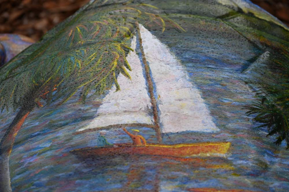 Fisher, who specializes in computer graphics and iphonography art, and Zedar, a more traditional painter, went entirely bright, transposing Renoir’s motifs to Waterfront Park in Palm Coast, and placing a likeness of themselves themselves in the row boat, and a couple of friends in the sailboat, with numerous other humoristic touches in the painting. “We both learned a lot about Renoir and extended our comfort levels and learned new techniques in order to honor Renoir,” Fisher said, showing mockups of the project on her phone. The driving question as they worked: “What would Renoir do?”