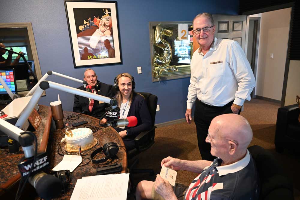 Tobin didn’t know it as he and David Ayres, president of Flagler Broadcasting, huddled in Ayres’s office late this afternoon, talking with Long. But when Tobin walked into the studio to record his 521st show, Ayres had surprised him with cake topped with a small bottle of vodka (a gift from Ayres and Marc Gilliland, the producer), a card from the staff, and what should have been a reunion of hosts, though only Alfin made it. Douglas was plying Atlantic waters somewhere, DeLorenzo was probably readying for this evening’s City Council meeting. Reporters filled in for the no-shows, and Tobin, as understated as ever, recollected.