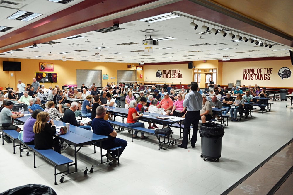 A restive neighborhood meeting that drew 120 people to the Indian Trails Middle School cafeteria Tuesday evening was a preview of the mobilizing opposition the Palm Coast Planning Board and the City Council will face later this year as the developer of the 268-home Matanzas golf course property in the L-Section again seeks to build 39 homes on a tract neighboring residents thought was to remain a natural viewshed in perpetuity.