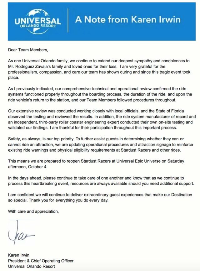 “To further assist guests in determining whether they can or cannot ride an attraction, we are updating operational procedures and attraction signage to reinforce existing ride warnings and physical eligibility requirements at Stardust Racers and other rides,” Irwin wrote without going into further details on what the ride warnings will now say or what the procedures will be.