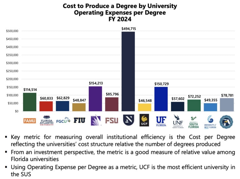 According to a state-authored report, New College of Florida costs Florida taxpayers nearly $500,000 to graduate each student, by far the highest cost among the 12 state universities.