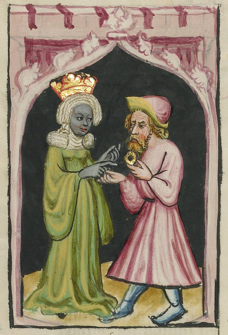 In stories, gifts could be imbued with magical powers. In the 13th century, in a history of the world, Rudolf von Ems recorded how Moses, when obliged to return home and leave his first wife Tharbis, an Ethiopian princess, had two rings made.