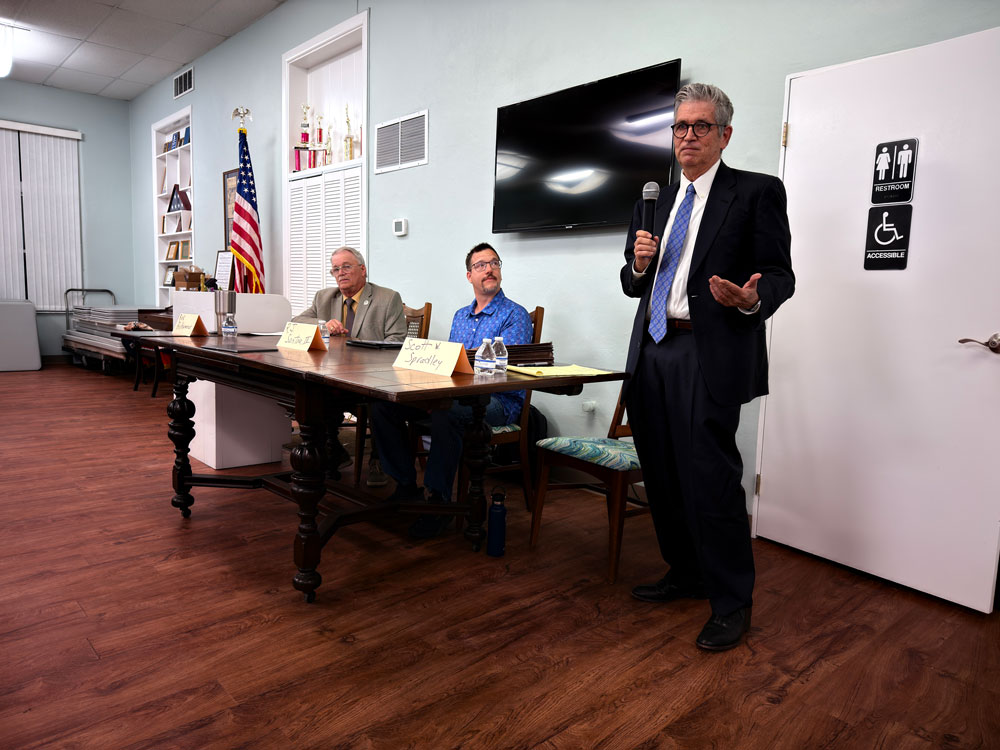 An attorney, Spradley frequently spoke to the crowd of a few dozen as if he were addressing a jury and he was making his case. He made it, personably and with command, always shading his exaggerations or mischaracterizations with legally defensible qualifiers, as when he insisted that annexation–the most recurring topic of the evening–was necessary as a hedge against Palm Coast. The claim that Palm Coast was about to annex the two sides of John Anderson Highway has never been substantiated beyond Flagler Beach officials’ own claims. Palm Coast officials have denied it. (A FlaglerLive request to city officials last April for such proof produced one email by the developer’s attorney that referred to the development, but not to annexation.)
